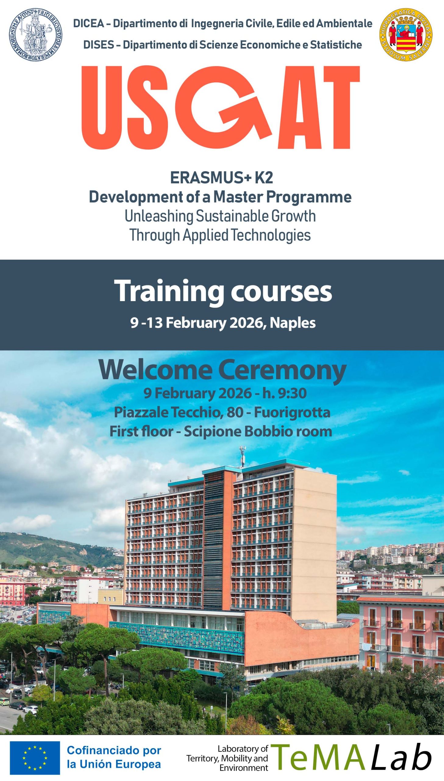TeMA Lab, il Laboratorio di Territorio, Mobilità e Ambiente del Dipartimento di Ingegneria Civile, Edile e Ambientale dell’Università degli Studi di Napoli Federico II, ospiterà i partner del progetto Erasmus+ USGAT dal 9 al 13 febbraio. L’iniziativa prevede la partecipazione di oltre sessanta docenti provenienti da atenei del Sud America (tra cui la National University of the Center of Perù, l’Escuela Politécnica Nacional Ecuador, l’Universidad Tecnológica Empresarial de Guayaquil e l’Universidad Nacional de Córdoba) che saranno coinvolti nelle attività di formazione, che si svolgeranno presso la sede Federiciana di Piazzale Tecchio.