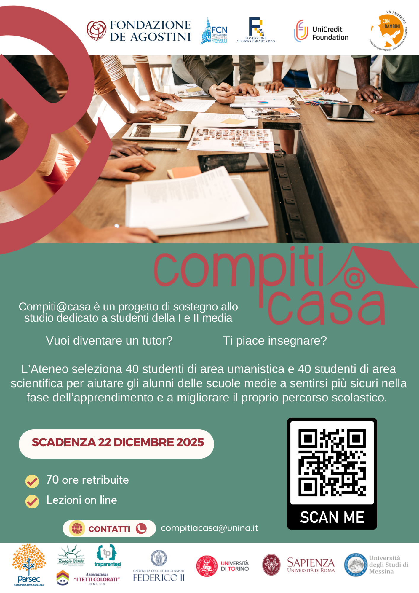 Progetto “Compiti@casa, curare la fragilità educativa”, per il reclutamento di studenti e studentesse regolarmente iscritti, in corso, a tempo pieno dal secondo anno dei corsi di laurea triennale, oppure iscritti a tempo pieno dal primo anno di laurea magistrale/specialistica, compreso il primo anno fuori corso, dell’Università degli Studi di Napoli Federico II e finalizzato all’assegnazione di una collaborazione a tempo parziale di 70 ore retribuite secondo i termini previsti dal bando. Il progetto è gestito da un partenariato nazionale, composto da Parsec Cooperativa Sociale (Capofila), Cooperativa Sociale Raggio Verde, Tra Parentesi APS, Associazione I Tetti Colorati, Università di Torino (Coordinamento Scientifico), Università di Roma La Sapienza, Università degli Studi di Napoli Federico II e Università di Messina. Il progetto è finanziato da Con I Bambini Impresa sociale S.r.l, Fondazione De Agostini, Fondazione Alberto e Franca Riva e Fondazione Comunità Novarese.